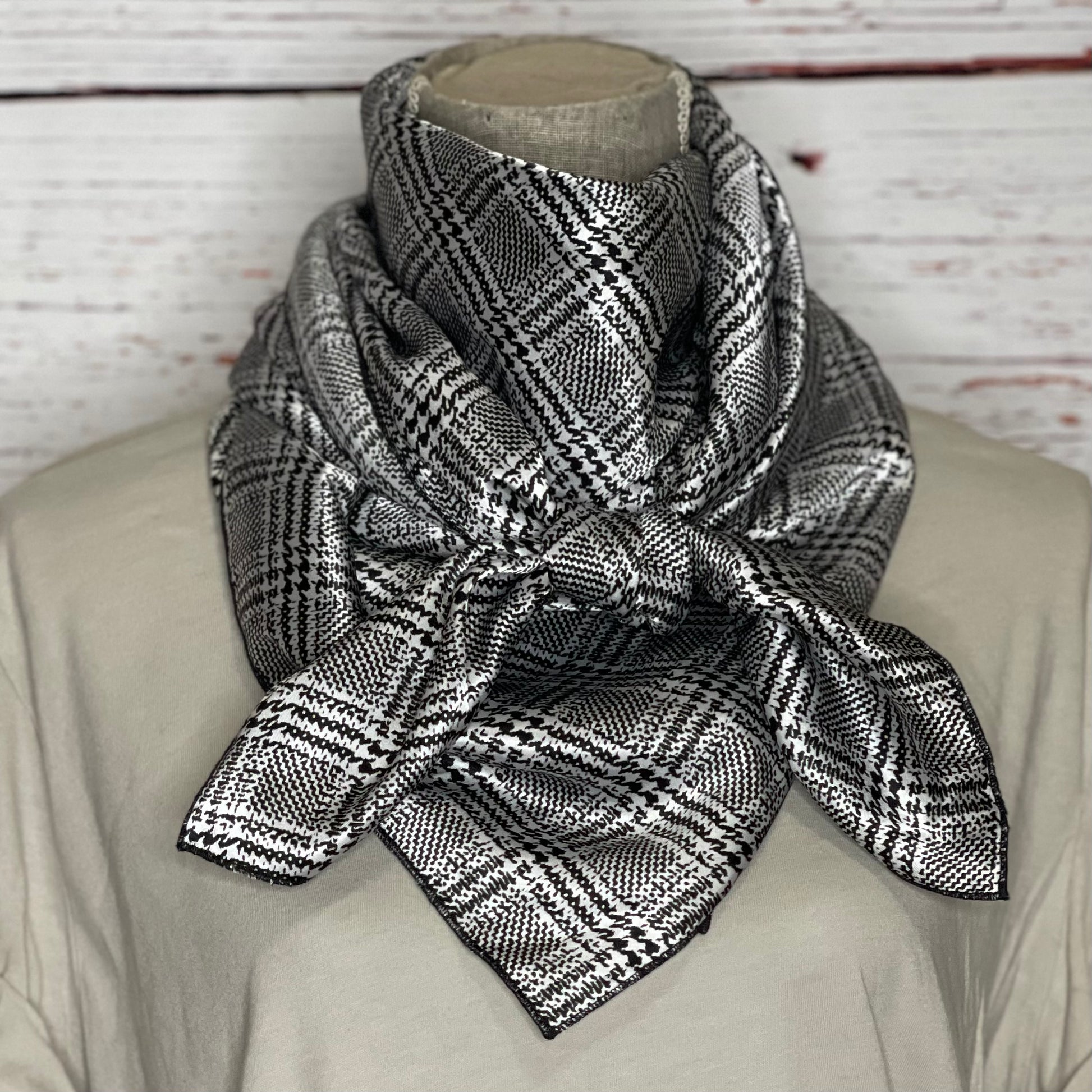Black striped block print approximately 42” silky polyester wild rag with black trim.