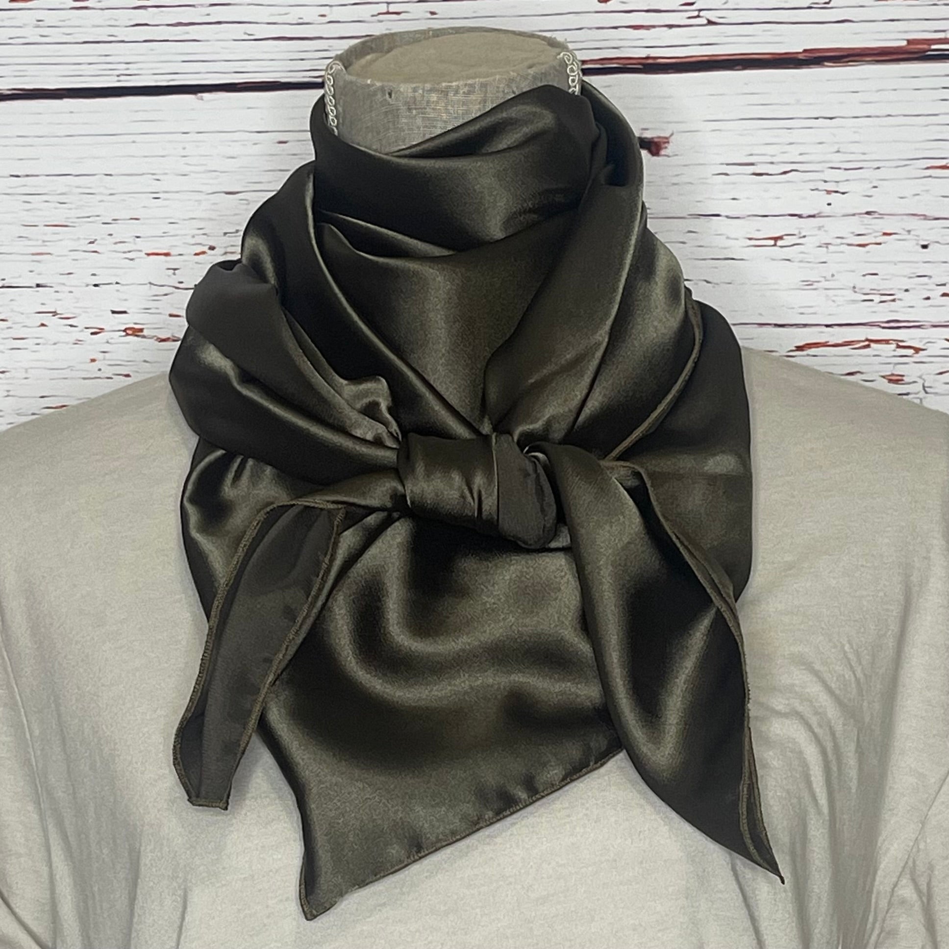 Oil slick green solid approximately 41” silky polyester wild rag with matching trim.