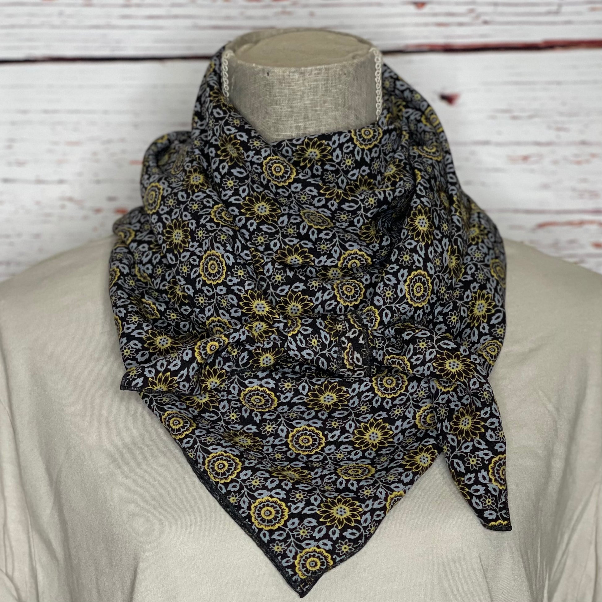 Yellow sunshine print approximately 41” wool peach wild rag with black trim.